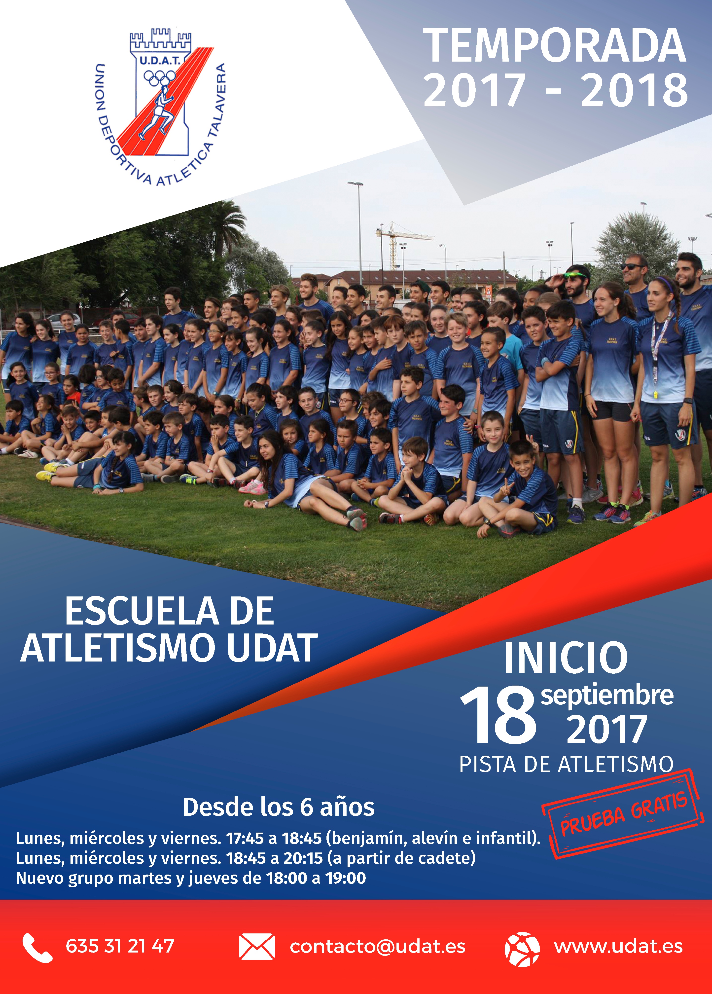 Ya está todo listo para dar comienzo a una nueva temporada en la Unión Deportiva Atlética Talavera, que abrirá la temporada con el inicio de la Escuela de Atletismo, que cada año reúne a un mayor número de niños en la “Pista de Atletismo” de nuestra ciudad. La pasada temporada la cifra de niños y jóvenes atletas en la Escuela de UDAT superó los 200, lo que muestra el gran progreso de este club talaverano.