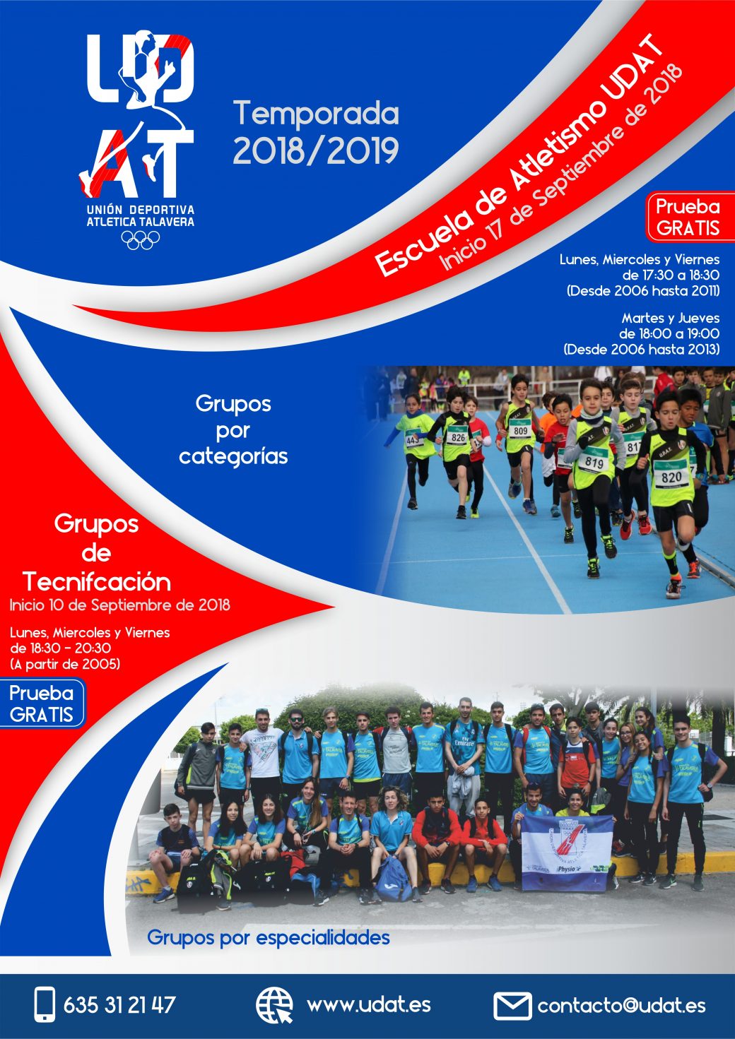 Todos los grupos de entrenamiento de UDAT, están dirigidos por Graduados en CCAFYD, Entrenadores y Monitores de Atletismo, o Profesores de Educación Física. Además, el club admite nuevos atletas durante toda la temporada, con un periodo de prueba gratuito para cada uno de ellos.
