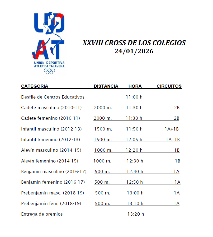 XXVIII CROSS DE LOS COLEGIOS udattalavera Noticias 24 DE ENERO DE 2026 A PARTIR DE LAS 11:00 ⇒REGLAMENTO DE LA PRUEBA Tweet Share 0 Reddit +1 Pocket LinkedIn 0 CROSS DE LOS COLEGIOS 16 enero, 2026